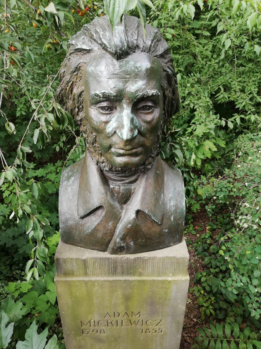 My, Polacy. Romantyczni i uparci. W Weimarze, pomimo map i opisów, Adama Mickiewicza ani śladu. Pozornie. Po wielkich poszukiwaniach, żałosnych i ohne Efektoow, w trakcie przypałacowych remontoow, w akcie desperacji, dowodzony ze skrzydła przy moście, niczym łobuz, wdrapawszy się na Parkan (a mandaty tu ponoć zacne) nagle twarzą w twarz stanąłem z Wieszczem!!! Się da!